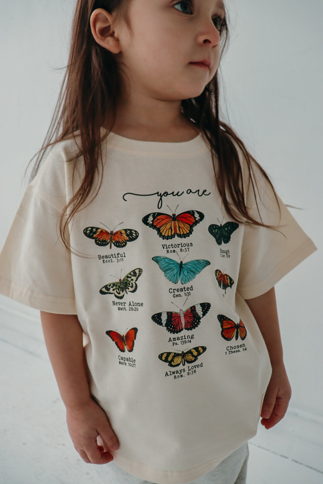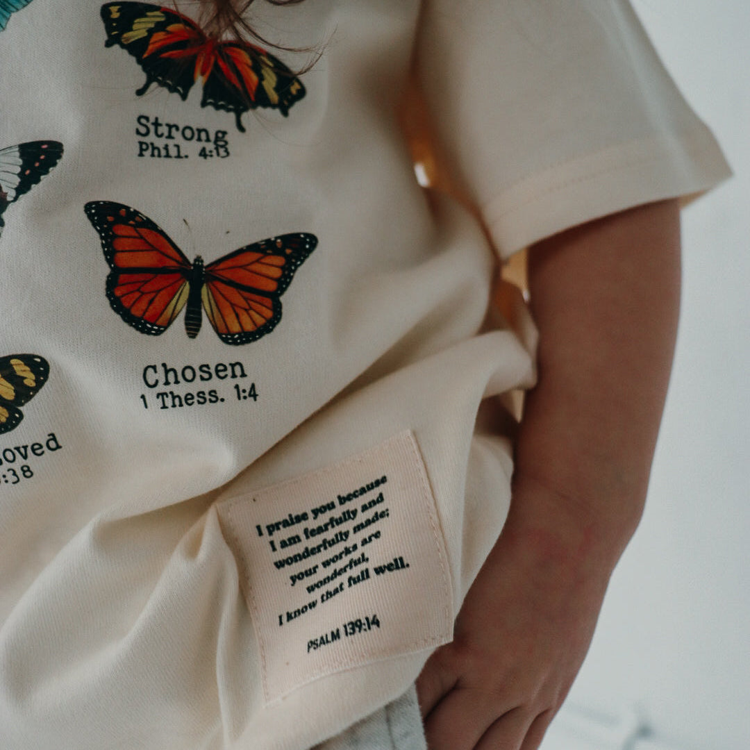 Crafted with 100% organic cotton, this soft and stylish tee is perfect for any occasion—whether it’s a playdate, school day, or church gathering. The delicate butterfly design adds a touch of charm to a message that will uplift her spirit.