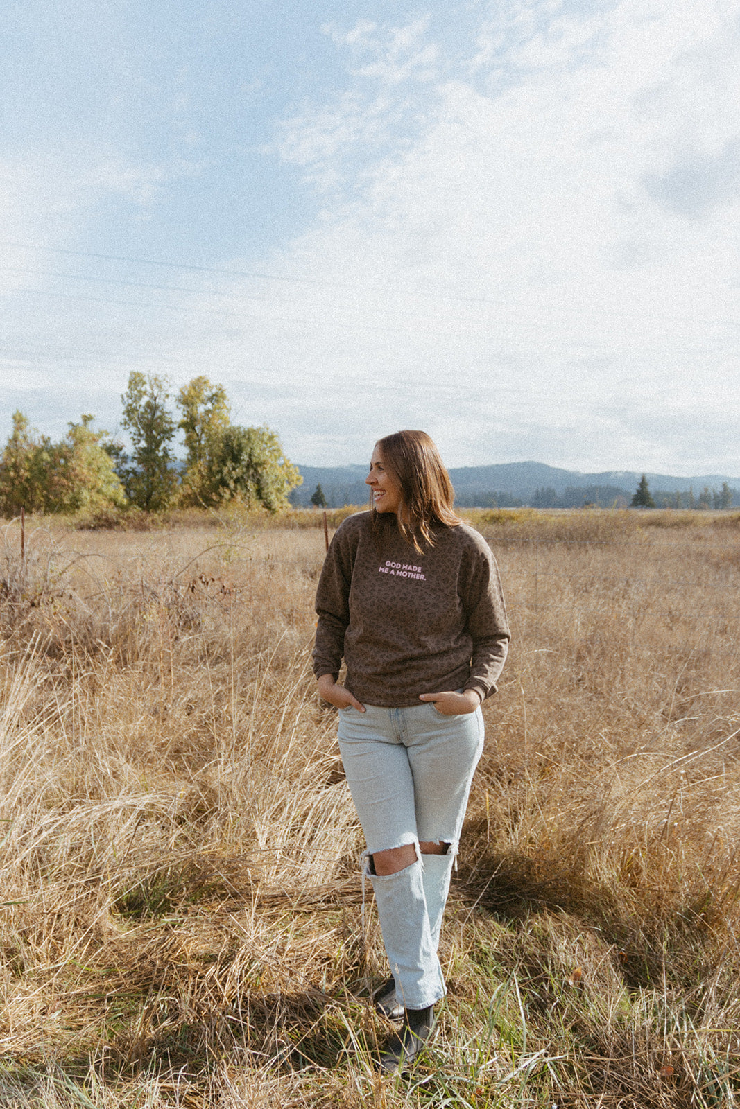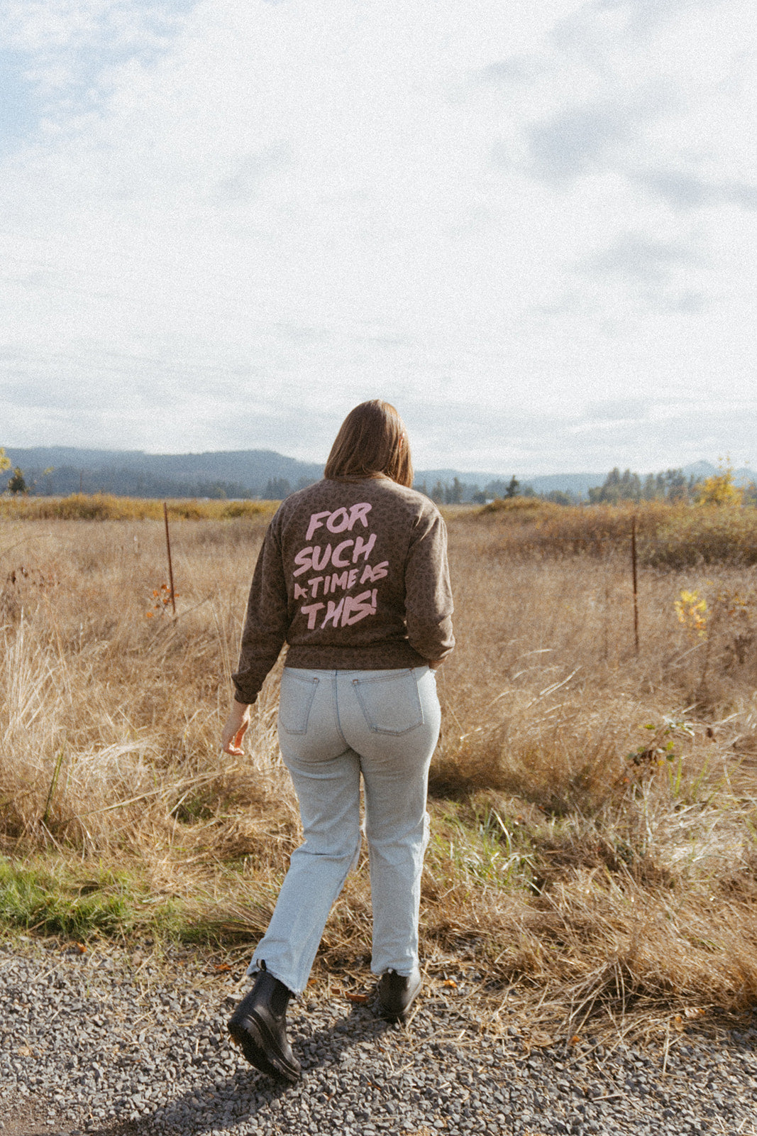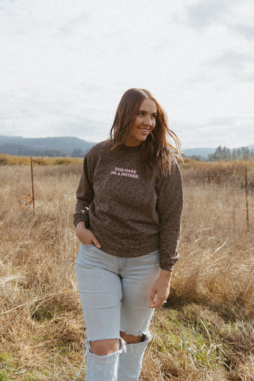 Designed with a striking leopard print base and vibrant pink lettering, this crewneck makes a statement while keeping you cozy. Pair it with leggings for everyday errands, or style it up with denim for a bold, faith-filled look.
