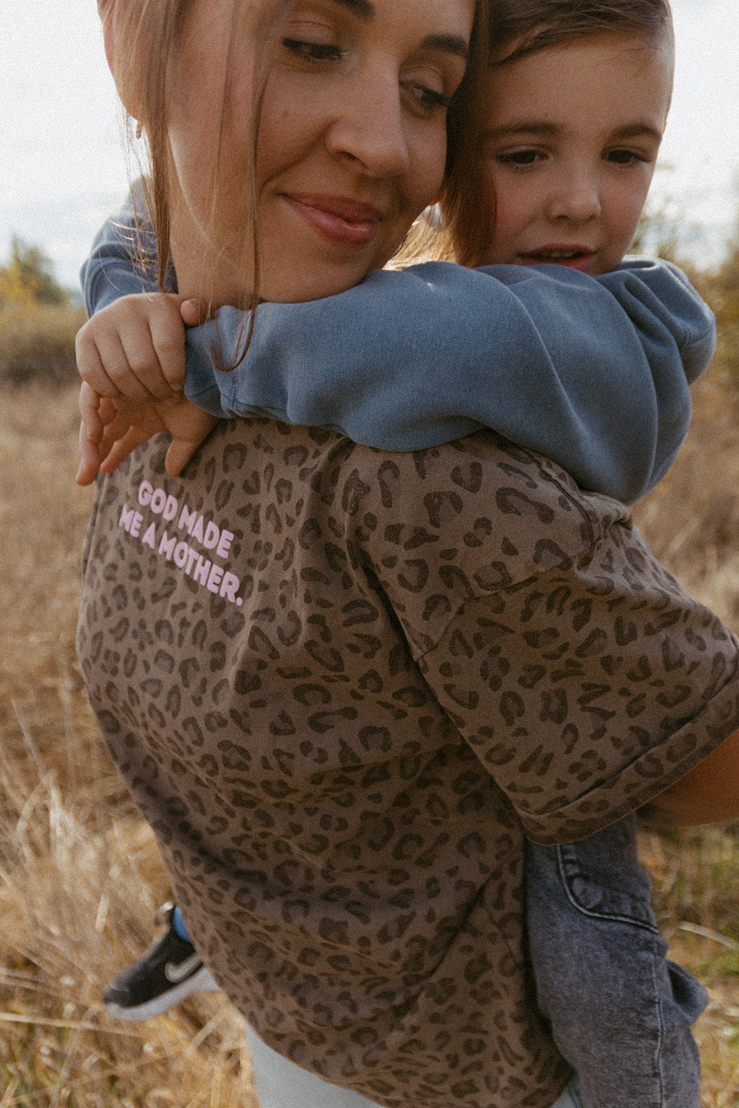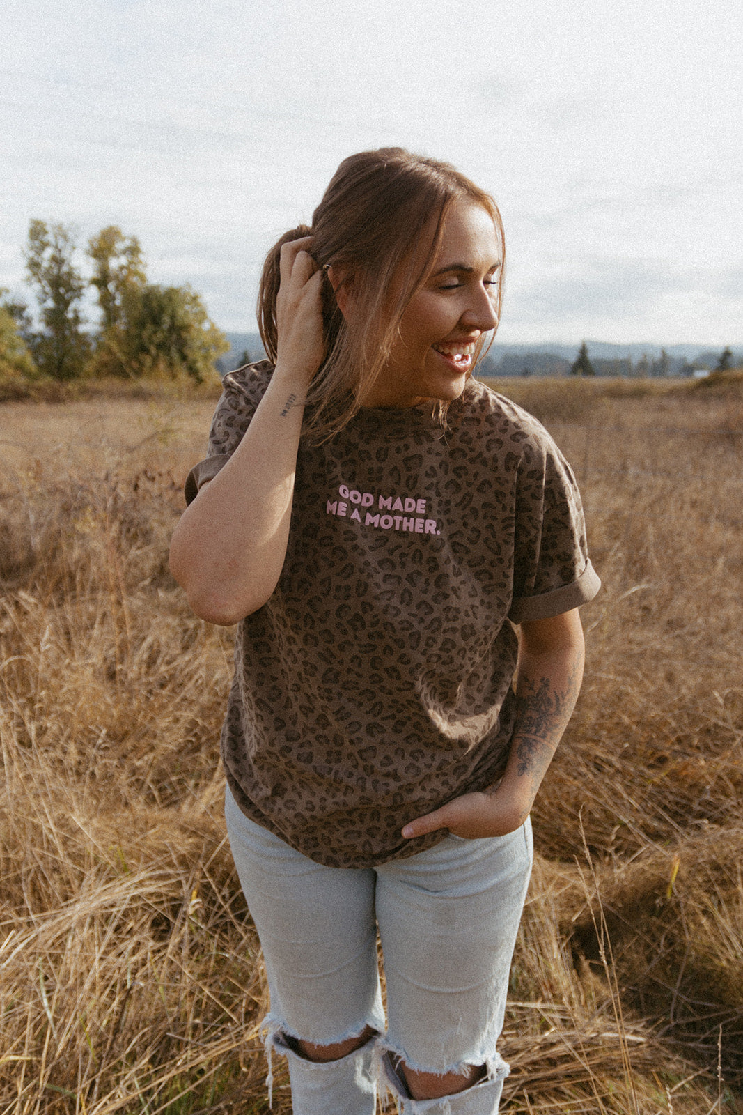 With its eye-catching leopard print base and bold pink lettering, this tee was designed to stand out while keeping Jesus at the center. Dress it up with jeans and boots or keep it cozy with joggers—either way, you’ll be walking in your purpose.